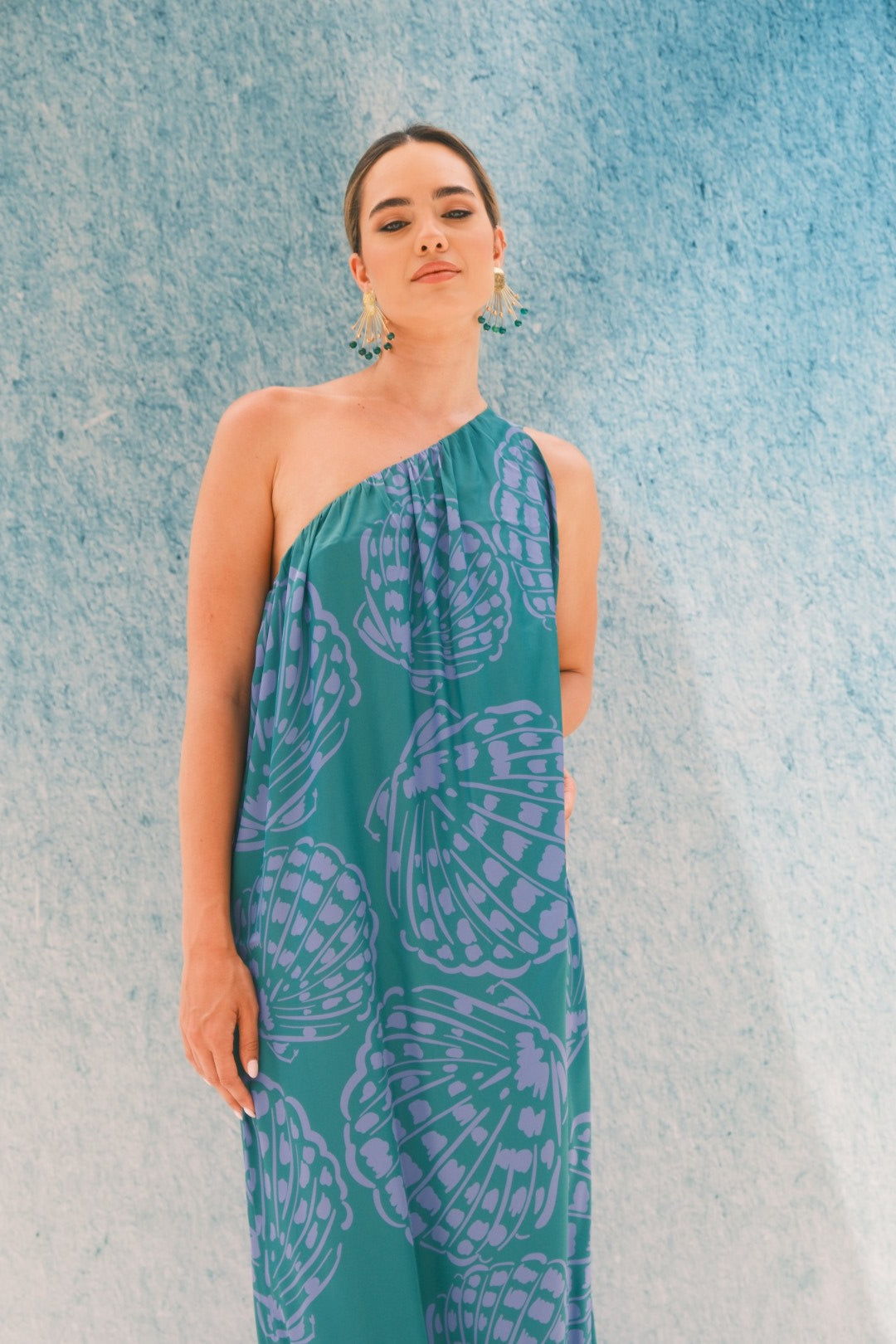 Effortlessly elevate your summer style with this elegant one-shoulder dress. Made from luxurious Armani silk, it features a playful seashell print in shades of green and lilac. The flattering one-shoulder design and flowing skirt create a relaxed yet sophisticated silhouette. Perfect for a summer gathering, cocktail party, or a night out.